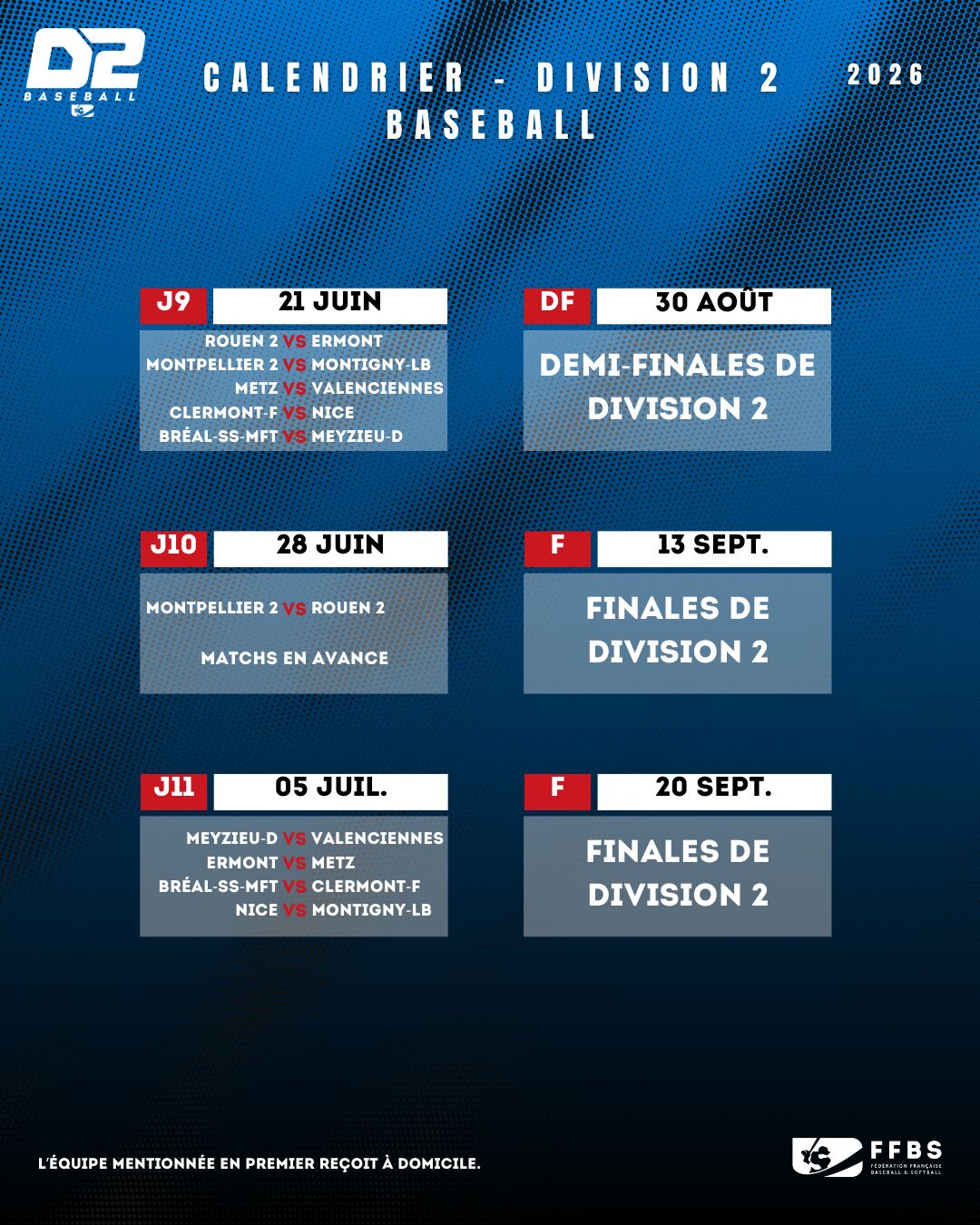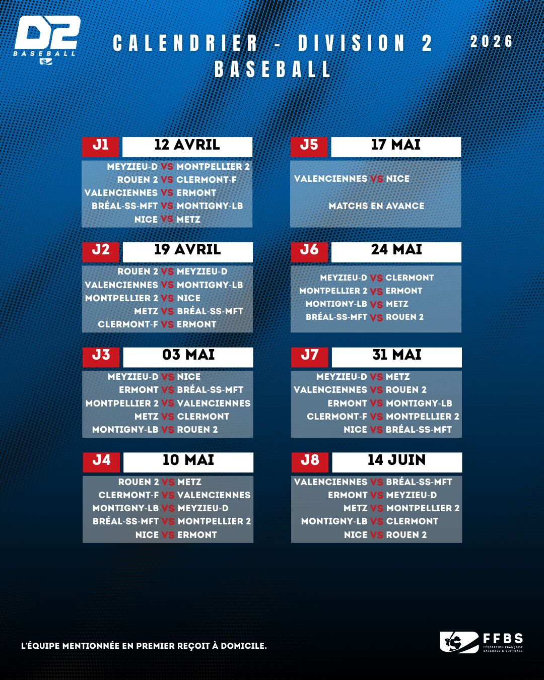 La Commission Fédérale Sportive de la Fédération Française de Baseball et Softball a annoncé le calendrier pour la saison 2026. L’Opening day aura lieu le 12 avril 2026 sur les terrains de Division 2 Baseball.