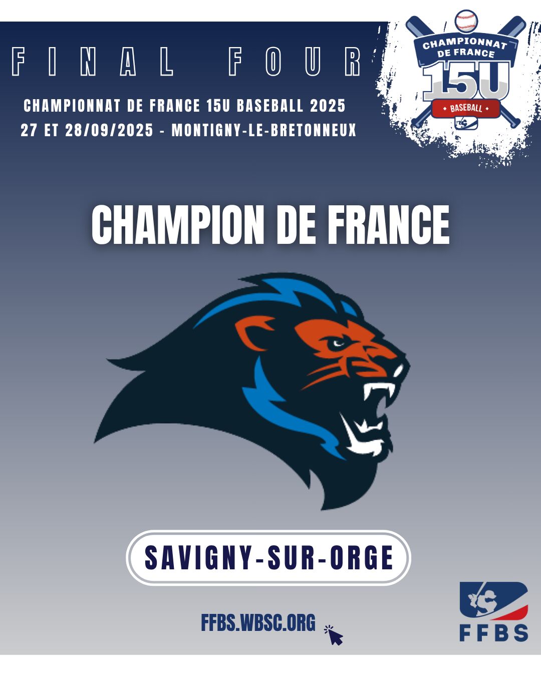 Le Final Four du Championnat de France 15U Baseball 2025 s’est tenu ce week-end à Montigny-le-Bretonneux. Après deux jours de compétition intense, c’est Savigny-sur-Orge qui a décroché le titre national en s’imposant en finale face au PUC.