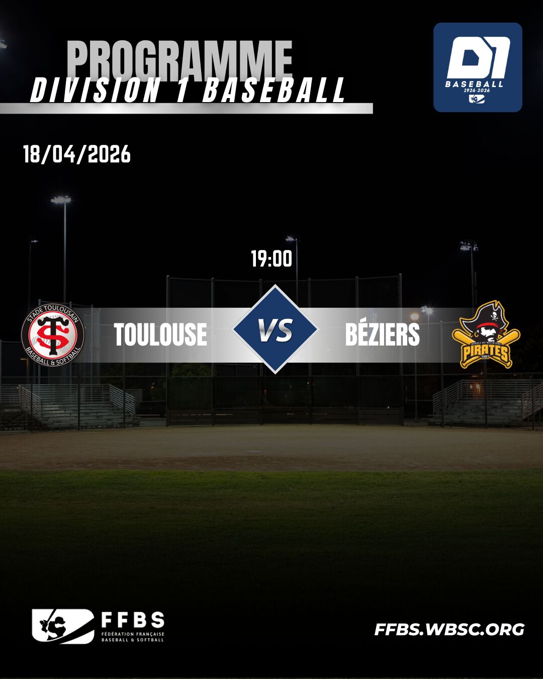 Suite aux conditions météorologiques lors de la deuxième journée, la Division 1 Baseball 2026 voit l’une de ses rencontres reprogrammée ce week-end. Il s’agit du deuxième match de la série entre Toulouse et Béziers, qui se jouera le samedi 18 avril 2026 à 19h00.