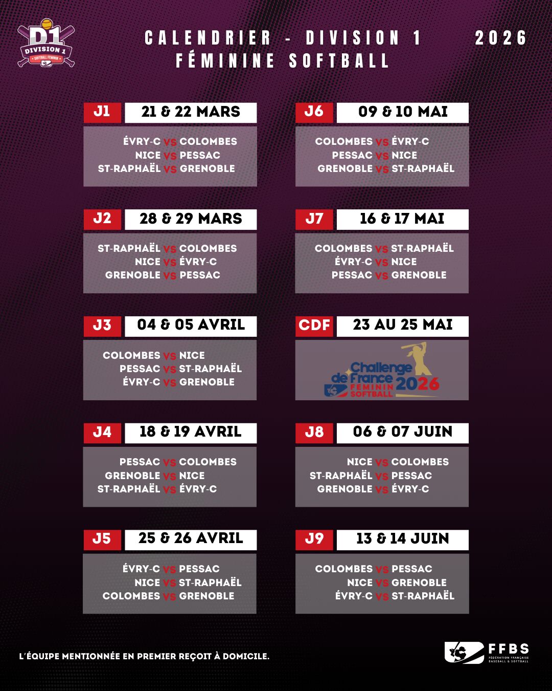 Nous sommes ravis de vous dévoiler le calendrier tant attendu du Championnat de France Division 1 Féminine Softball 2026. Les six équipes débuteront la saison les 21 et 22 mars 2026, prêtes à en découdre pour décrocher le titre tant convoité de championnes de France.