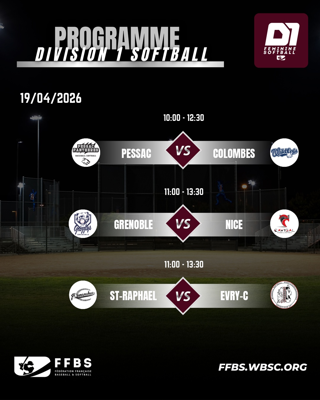 Après une troisième journée qui a confirmé les dynamiques en tête du championnat, la Division 1 Féminine Softball poursuit sa saison avec la quatrième journée, programmée le dimanche 19 avril 2026.