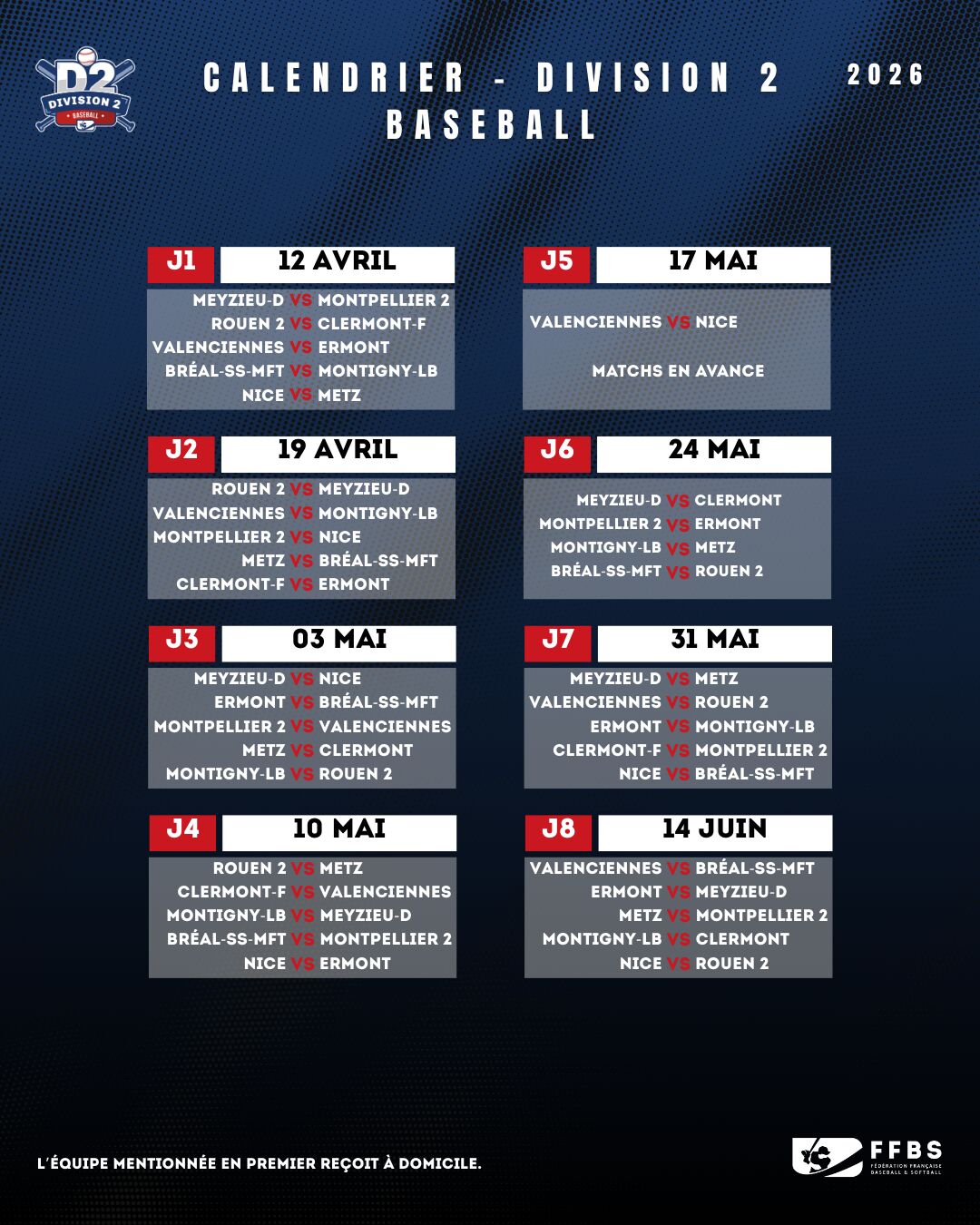 Nous sommes ravis de vous dévoiler le calendrier du Championnat de France Division 2 Baseball 2026. Les dix équipes débuteront la saison le 12 avril 2026.
