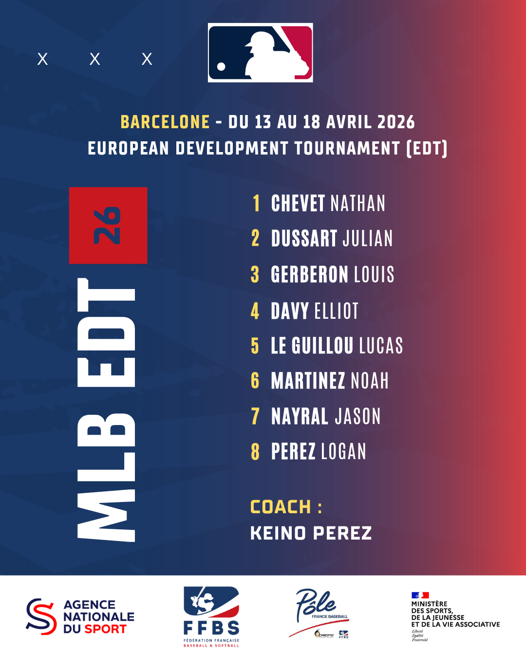 Huit joueurs issus de la filière de haut niveau française ont été conviés par la Major League Baseball (MLB) à participer au European Development Tournament (Tournoi de développement européen), qui se tiendra à Barcelone du 13 au 18 avril 2026.