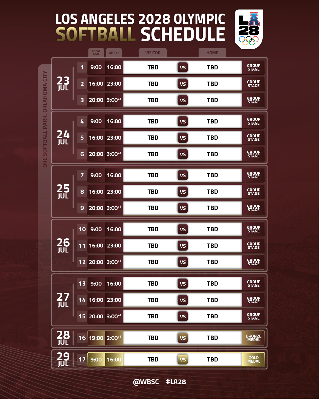 Le tournoi olympique de Baseball débutera jeudi 13 juillet 2028 au Dodger Stadium, soit la veille de la cérémonie d’ouverture. Après une pause le 14 juillet pour les festivités officielles, la compétition reprendra le 15 juillet et se poursuivra jusqu’au 19 juillet.
