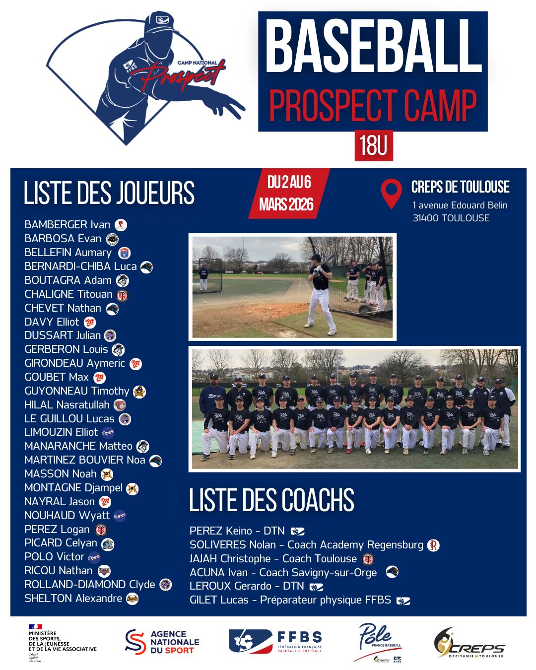 Retrouvez ci-dessous la liste complète des joueurs et du staff présents pour cette édition 2026 du Prospect Camp 18U Baseball.