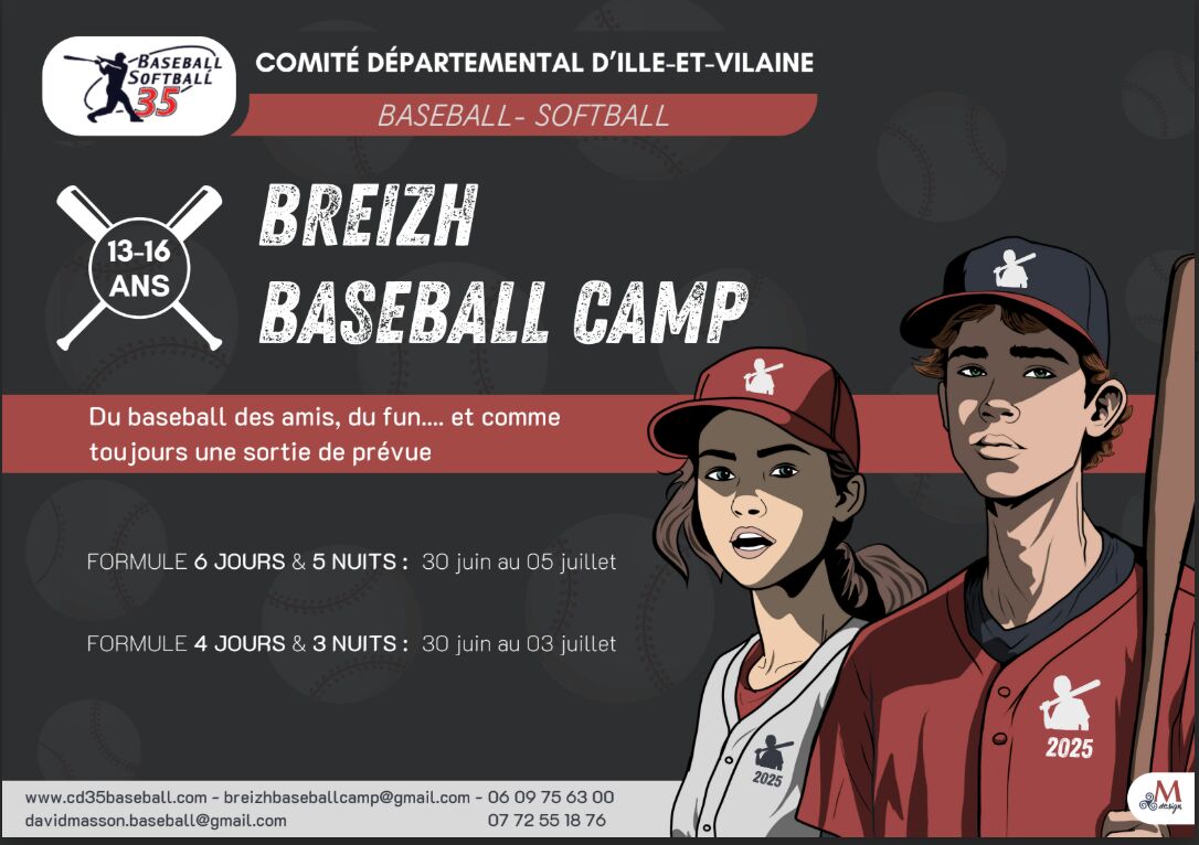 Les inscriptions au Breizh Baseball Camp 2026 sont ouvertes !– Camp 16U (13/16 ans) : stage court (205€) du 30 juin au 3 juillet 2026 et stage long (270€) du 30 juin au 5 juillet 2026.– Camp 12U (8/12 ans) : stage court (205€) du 5 juillet au 8 juillet 2026 et stage long (270€) du 5 juillet au 10 juillet 2026.Il n’y a pas de réservation possible sans passer par l’inscription via le site du CD 35 Baseball :N’oubliez pas de fournir les pièces habituelles :– Fiche sanitaire de liaison– Droit à l’imageUne fois vos démarches faites, vous aurez un retour par mail dans la semaine qui suivra votre inscription.Merci de diffuser l’information à l’ensemble de vos adhérents, aux coachs et aux entraîneurs.Plus d'informations -